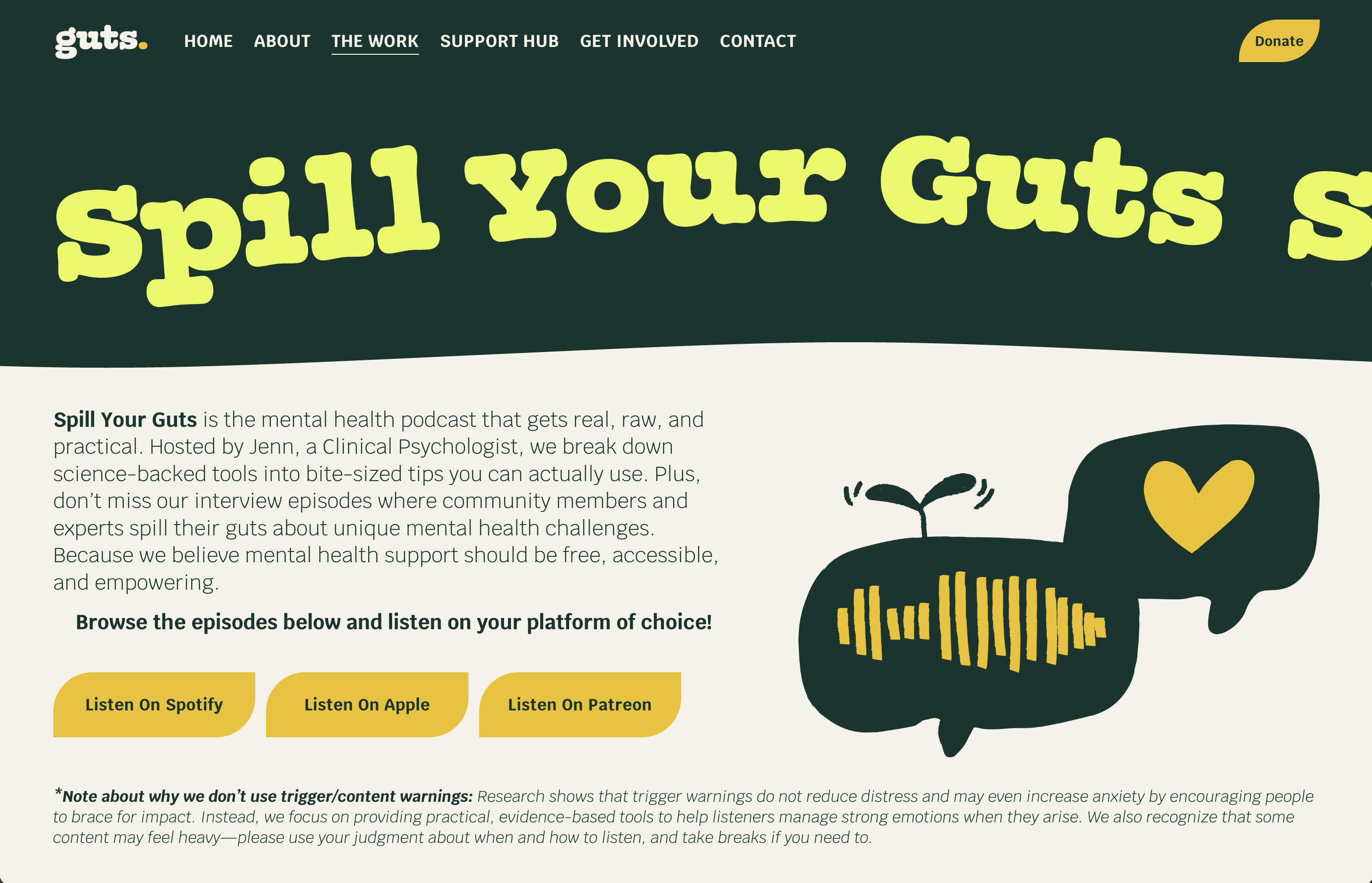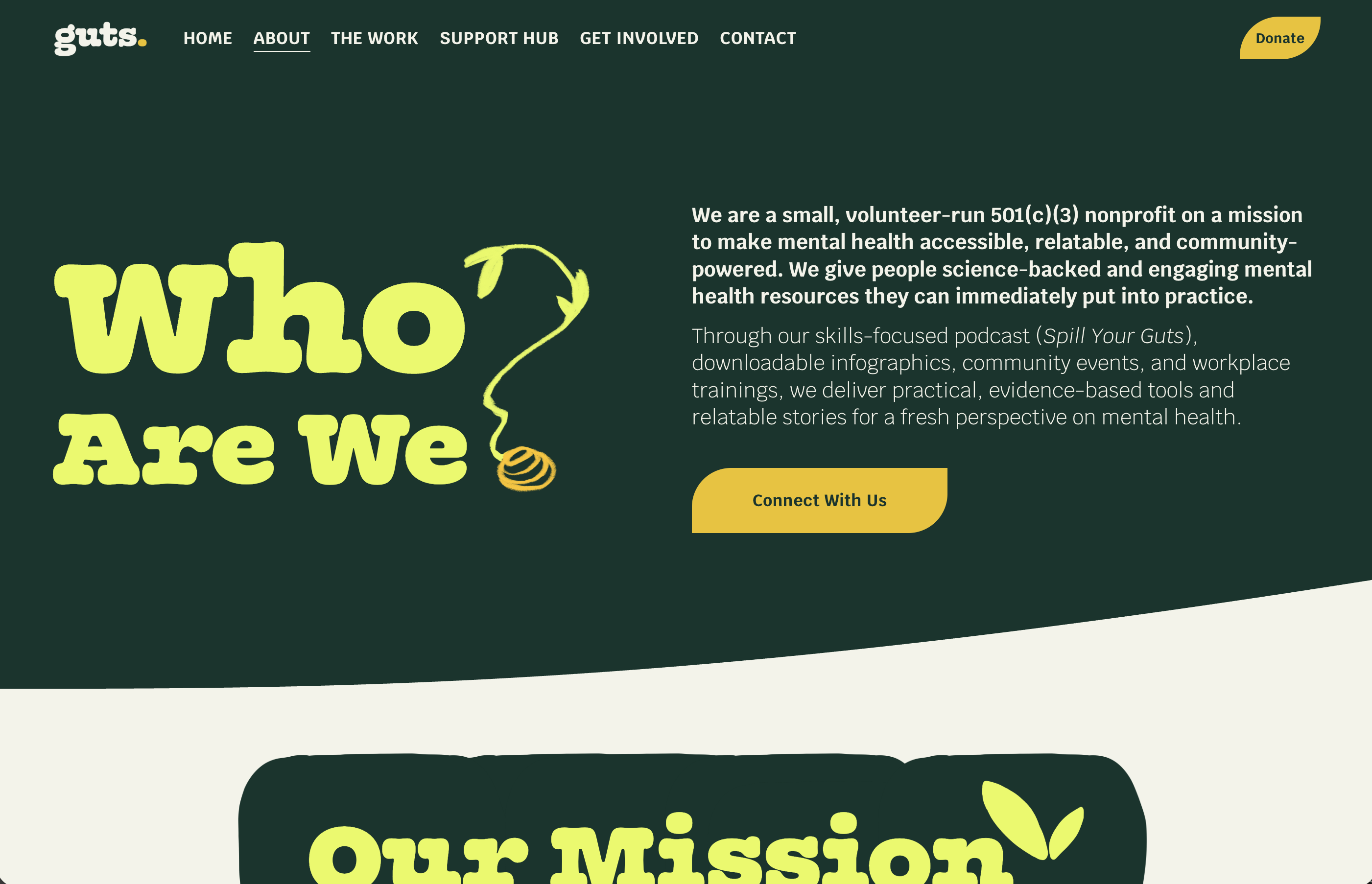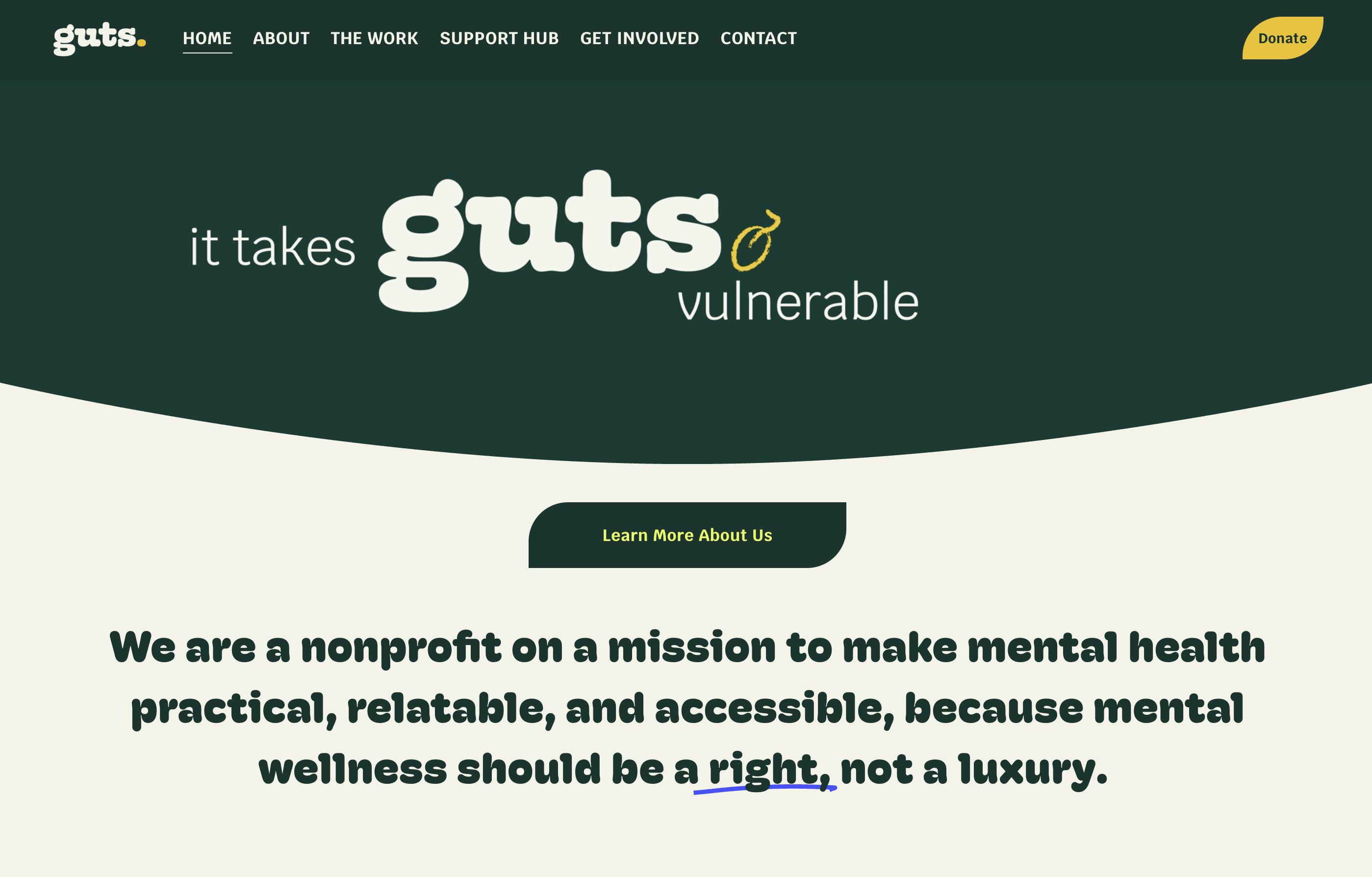 I am currently at guts. , a nonprofit organization dedicated to making mental health practical, relatable, and accessible through science-backed tools and resources, following the completion of their recent rebranding by Kelly Guo and Lilia Geguchadze. Brought on board to build on this, I have been contributing through graphic design, accessibility, and new content. My work focuses on helping engagement in programming through design and ensuring the site and its content are more intuitive and accessible to those with disabilities. I’m grateful to support the mission of empowerment, education, and community-building for those navigating mental health challenges.
